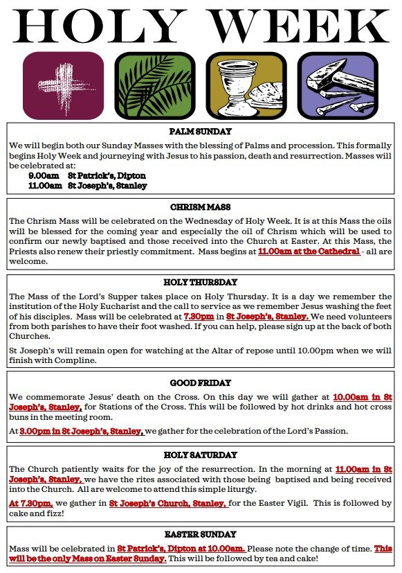 Keep up to date with news from the Catholic parishes of St. Joseph Stanley and St. Patrick Dipton. We publish our newsletter towards the end of every week.